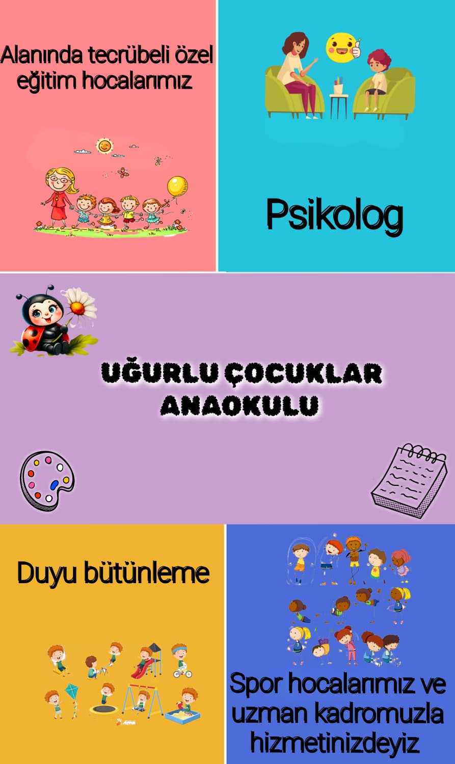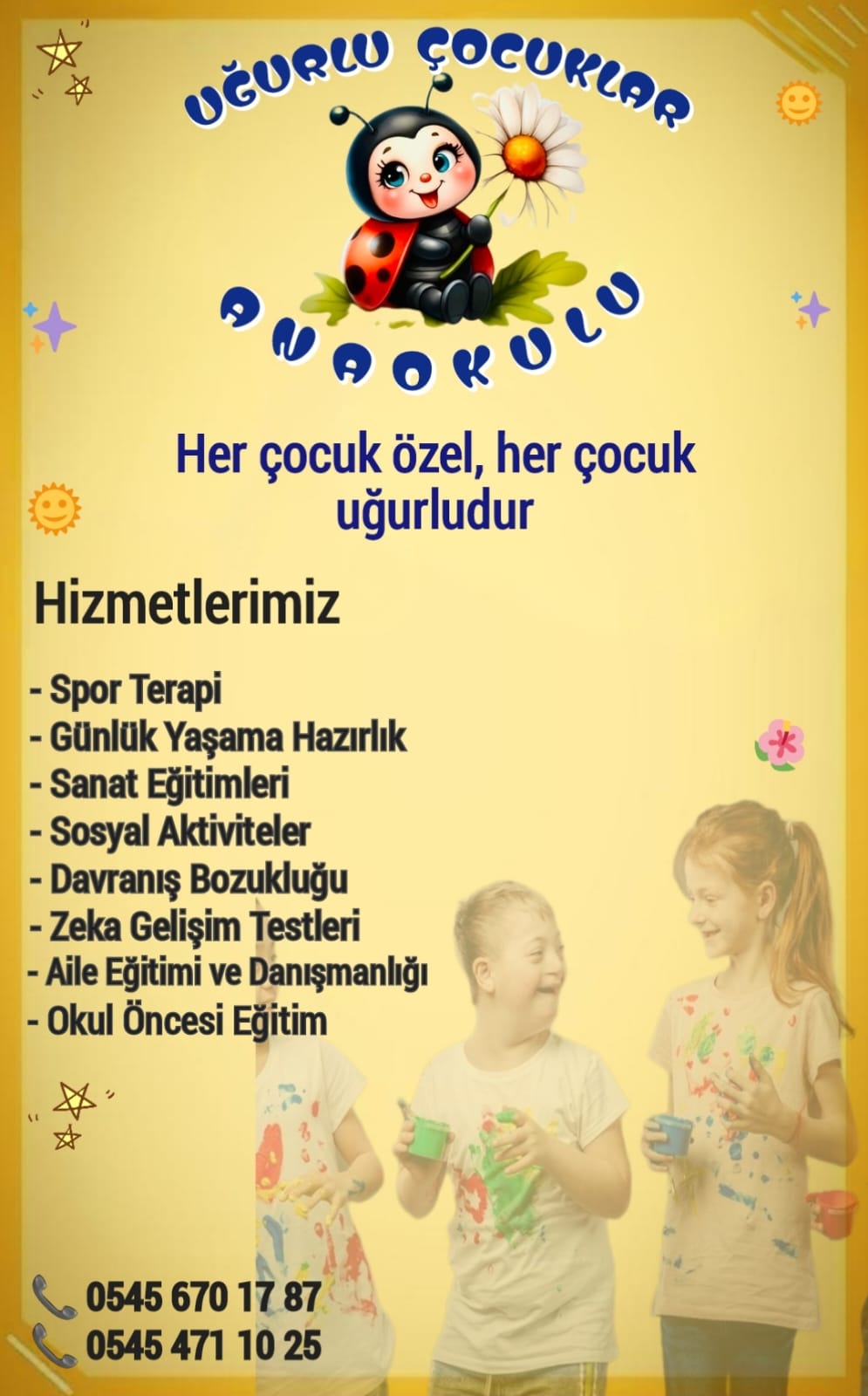 Etkinlik Ve HizmetlerimizUğurlu Çocuklar Anaokulu olarak, her çocuğun farklılıklarıyla değerli olduğuna inanıyoruz. Amacımız; normal gelişim gösteren çocuklar ile özel gereksinimli çocukların, sevgi, saygı ve anlayış ortamında bir arada büyüyebildiği kapsayıcı bir eğitim modeli geliştirmektir. Çocuklarımızın bireysel potansiyellerini en üst düzeye çıkararak; özgüvenli, paylaşımcı ve topluma değer katan bireyler olmalarını hedefliyoruz.